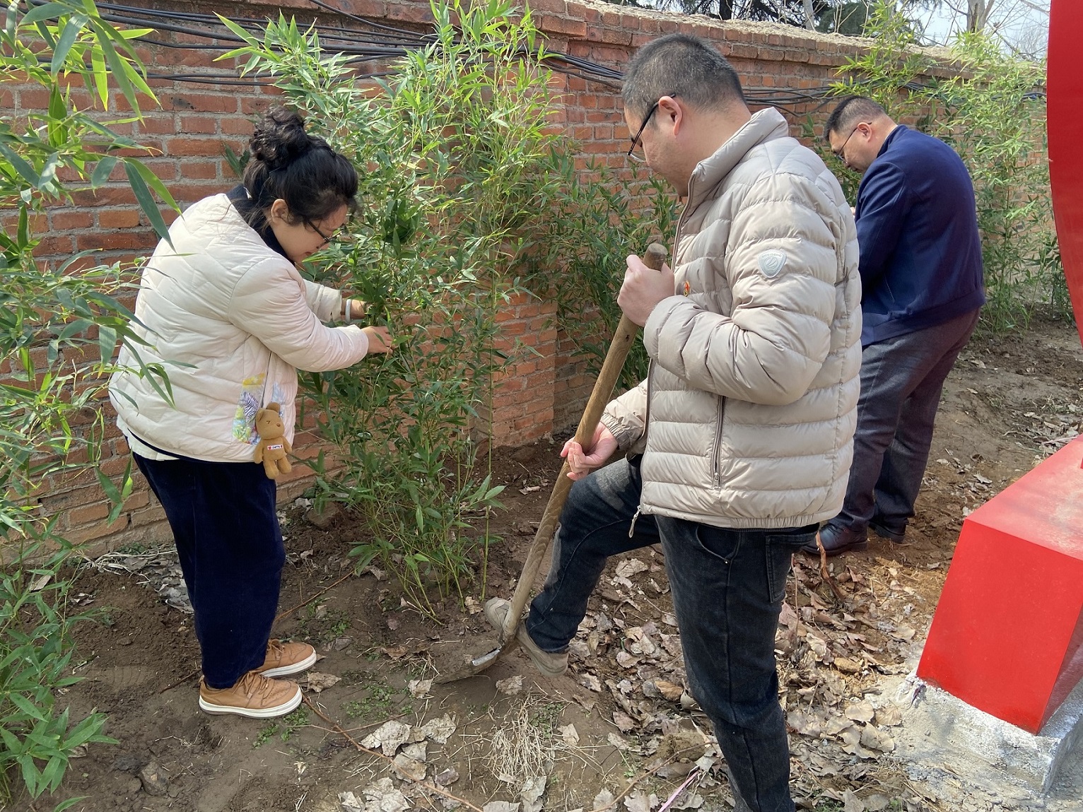 曲阜驻地党支部党员、入党积极分子热情昂扬,大家分工协作,配合默契,挥锹铲土、扶树填坑、踏土夯苗、培土浇水,道道工序规范严格,认真细致地栽种每一棵树苗,经过辛勤劳作,为文化长廊增添了浓浓绿意。